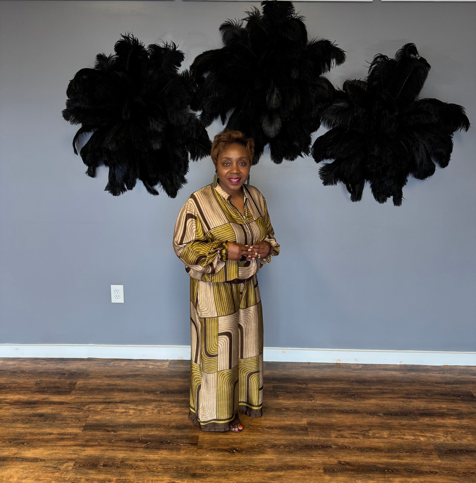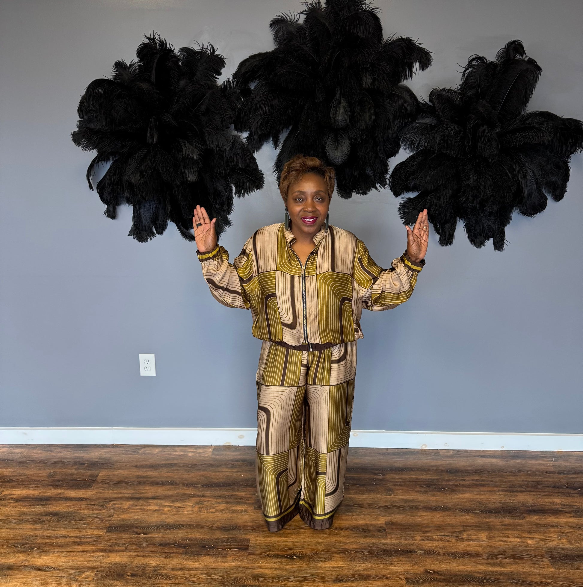 Turn heads in this bold and chic two-piece satin set featuring a striking geometric maze print in shades of gold, bronze, and deep olive. The relaxed button-up blouse with long sleeves pairs effortlessly with wide-leg trousers for a look that’s both comfortable and elevated. Perfect for making a stylish statement at social gatherings, cultural events, or nights out, this set brings luxury and confidence with every step.