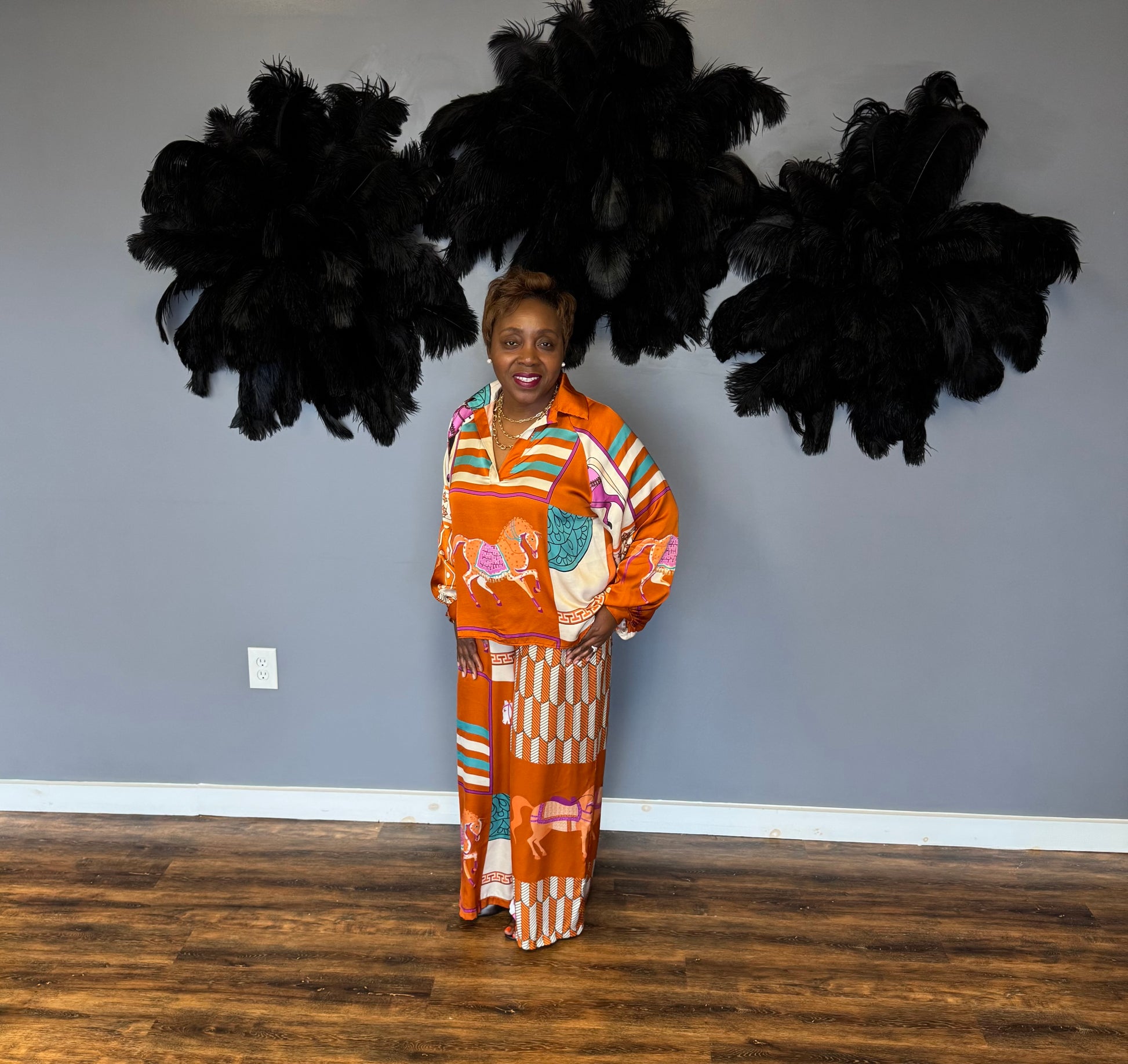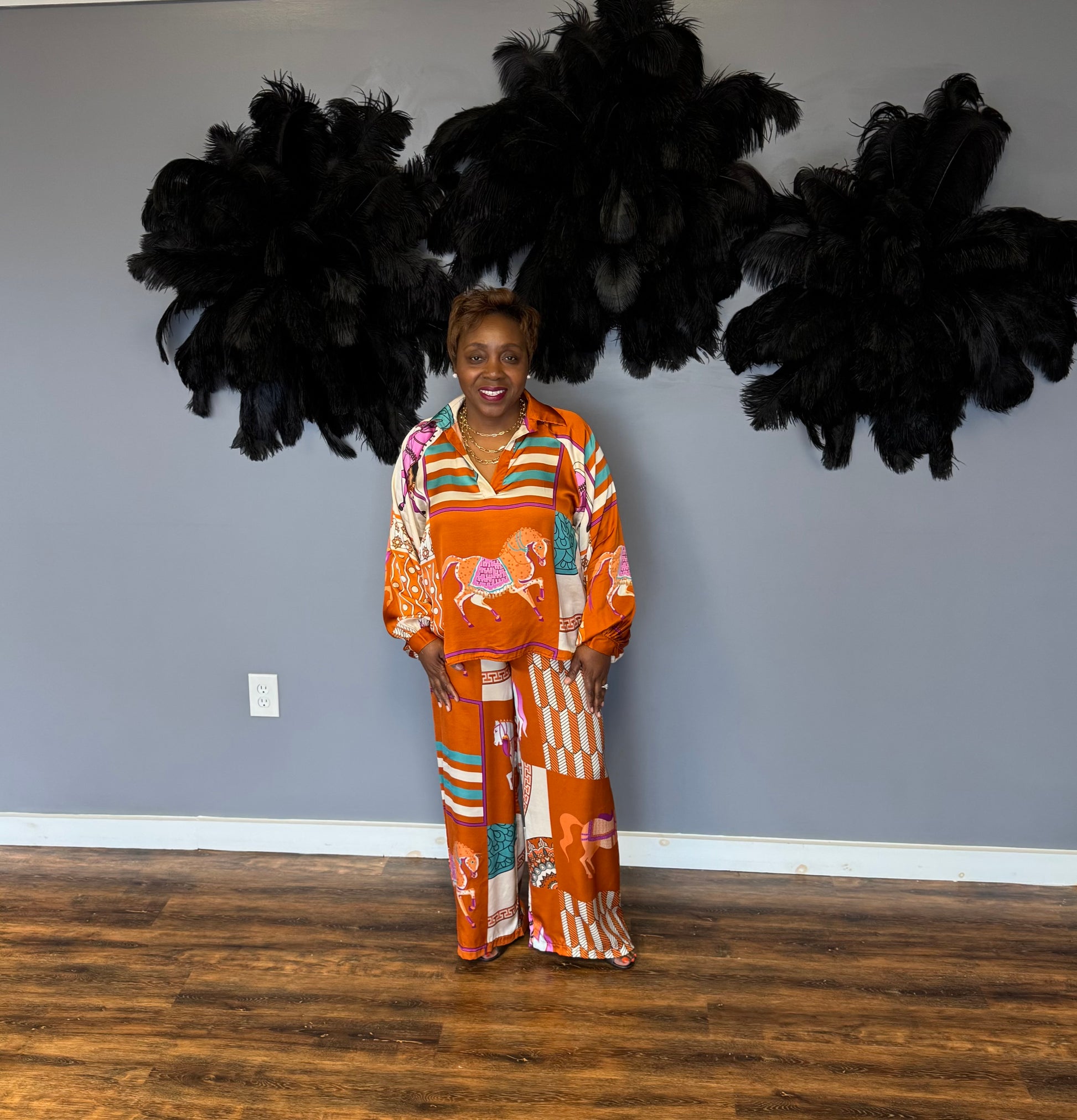 Turn heads in this luxe satin two-piece set that brings artful elegance to your wardrobe. Featuring a bold mix of equestrian-inspired prints, geometric accents, and rich autumn tones, this outfit is all about statement style. The button-front top offers a relaxed, breezy fit with cuffed sleeves for added flair, while the wide-leg pants create effortless flow and movement. Whether worn together for a show-stopping look or styled separately, this set exudes confidence and sophistication—perfect for brunches, special events, or a chic night out.