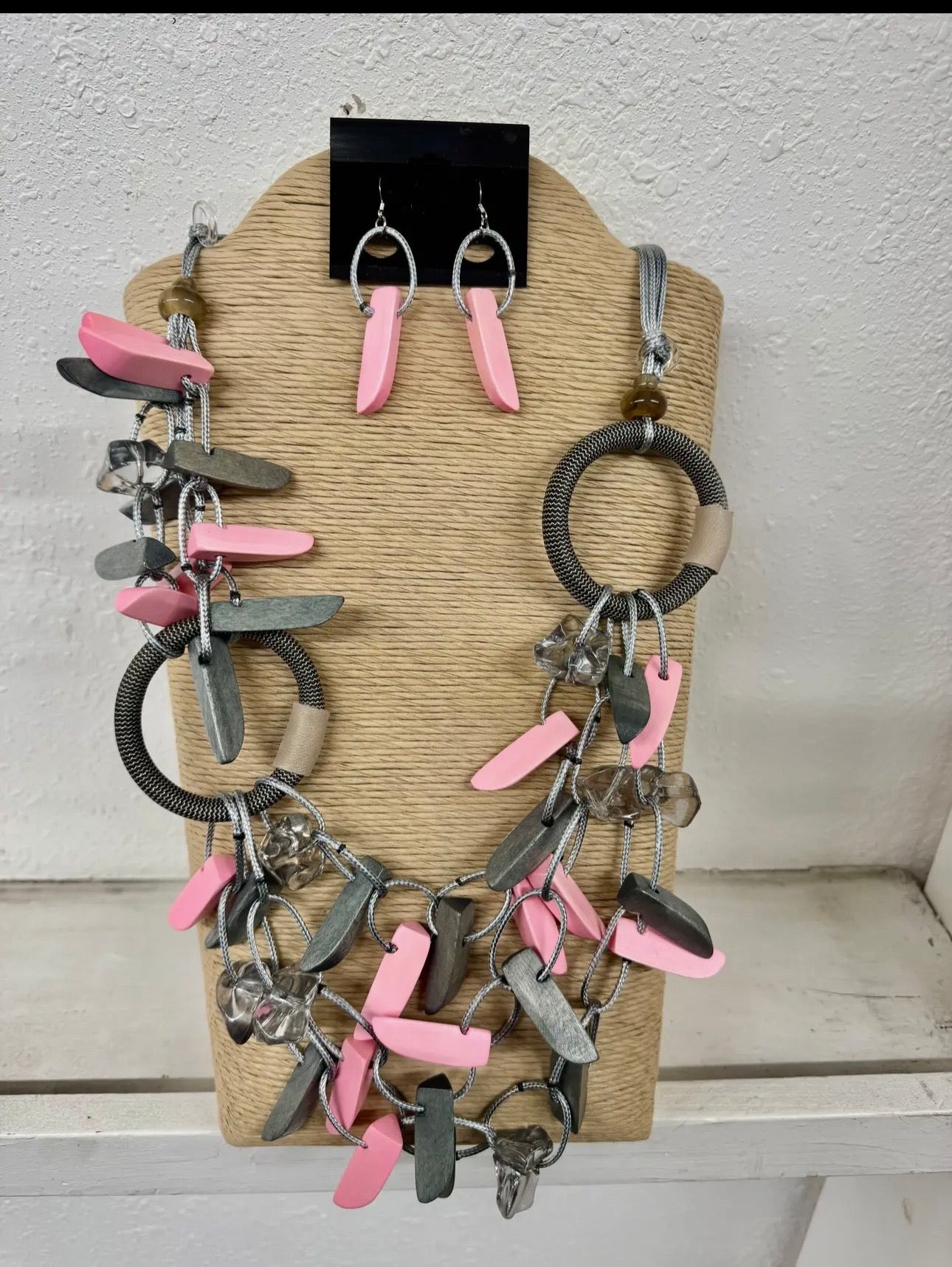 Bold, modern, and full of personality. The Rhythm & Motion Statement Necklace Set features an eye-catching mix of sculptural elements, layered cords, and dangling accents that create beautiful movement with every step. Designed to stand out while remaining lightweight, this piece brings an artistic edge to casual looks and adds flair to dressier outfits. Finished with coordinating drop earrings for a perfectly styled set.